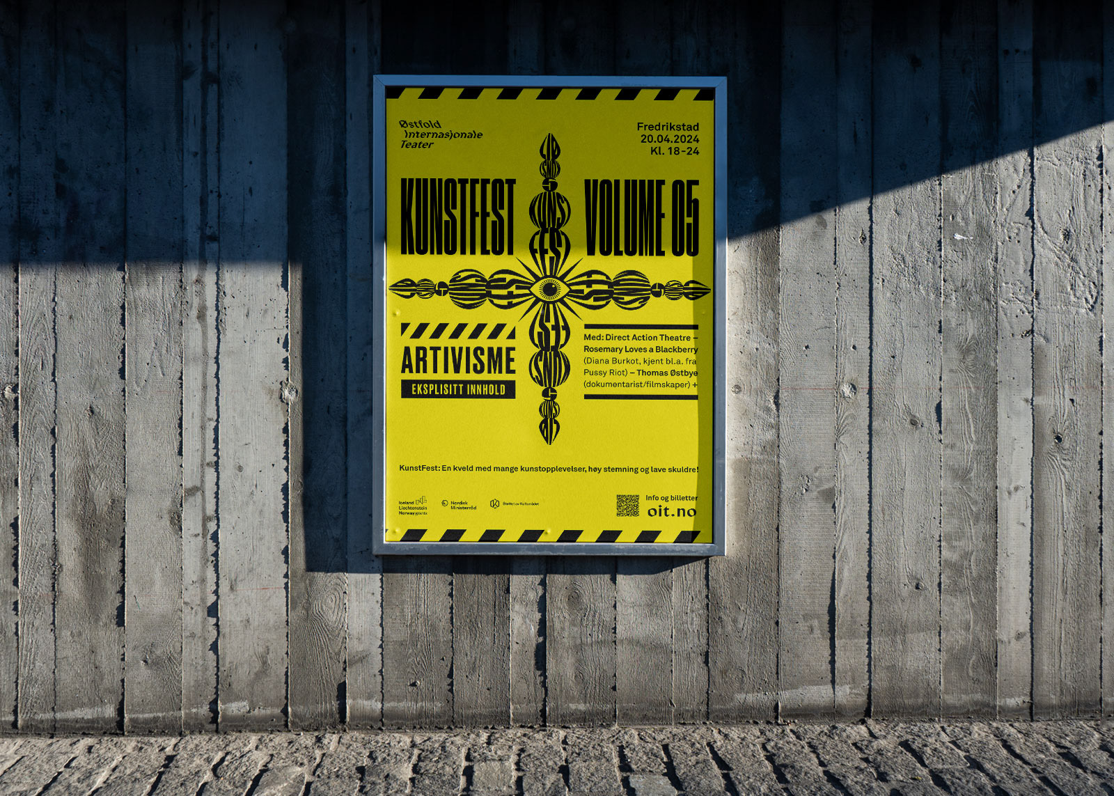 På bestilling fra Østfold Internasjonale Teater lagde vi et designkonsept med visuell identitet, faste visuelle elementer, men med mulig å endre den visuelle tematikken år etter år for Kunstfest-oppsetningen. Årest tema symboliserer «fare».