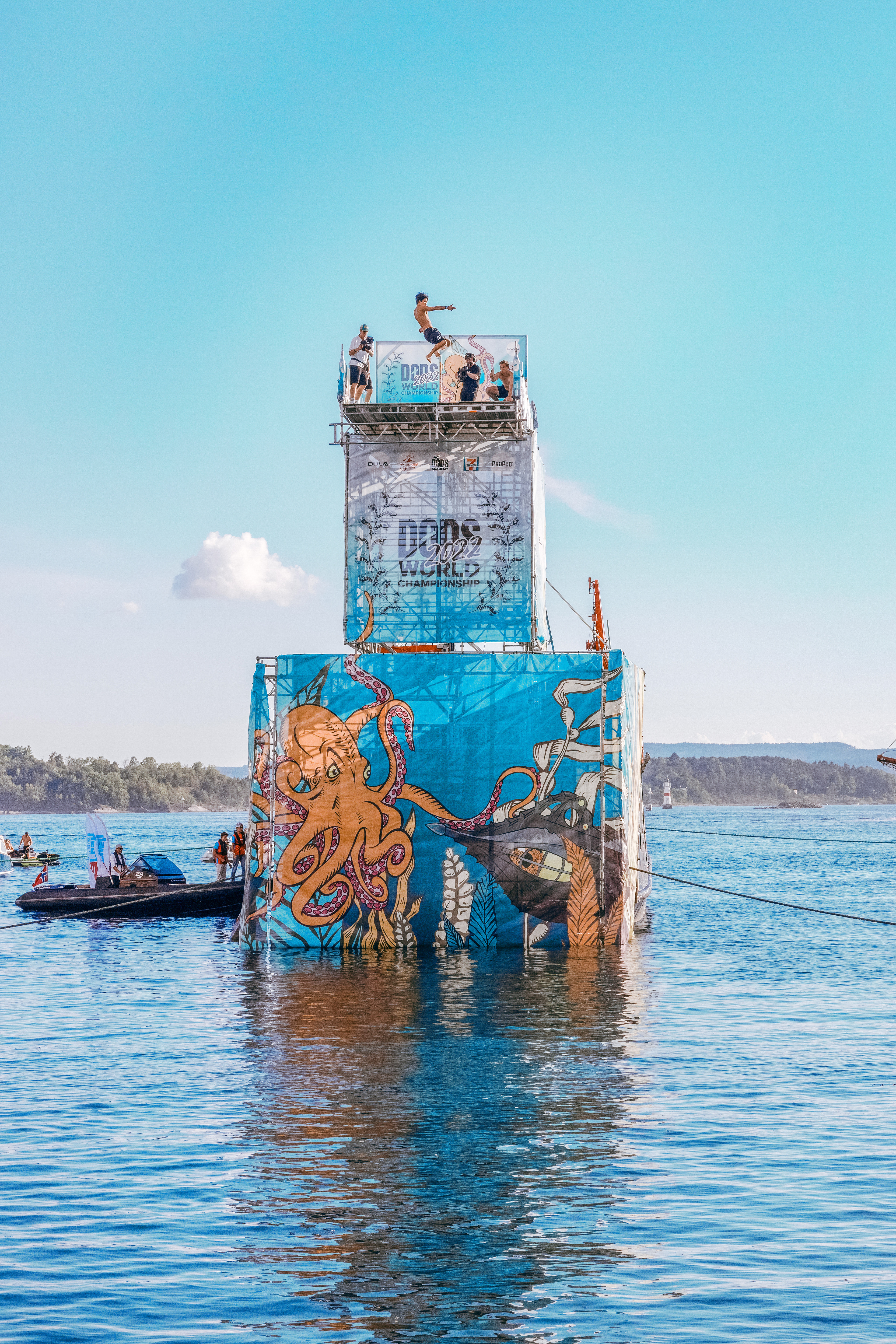 VM i Dødsing 2022 ble et spektakulært arrangement i en av verdens mestvoksende idretter! Ikke bare ble det publikumsrekord, direktesendt TV2-sending og ca. 100 millioner views, men eventet omringet hele Rådhuskaia i fet stemning til et turistrikt sentrum og en båtstappet fjord. Kunstverket i havna i år, var ikke bare dødsernes ekstremstup! M/S Bjørvika lå midt i havna med selve stupetårnet strappa på. Og med tårnet mesh-wrappet inn i selve kampen mellom Kaptein Nemo og blekkspruten, var det bare å nyte dette nautiske dødseeventyret!